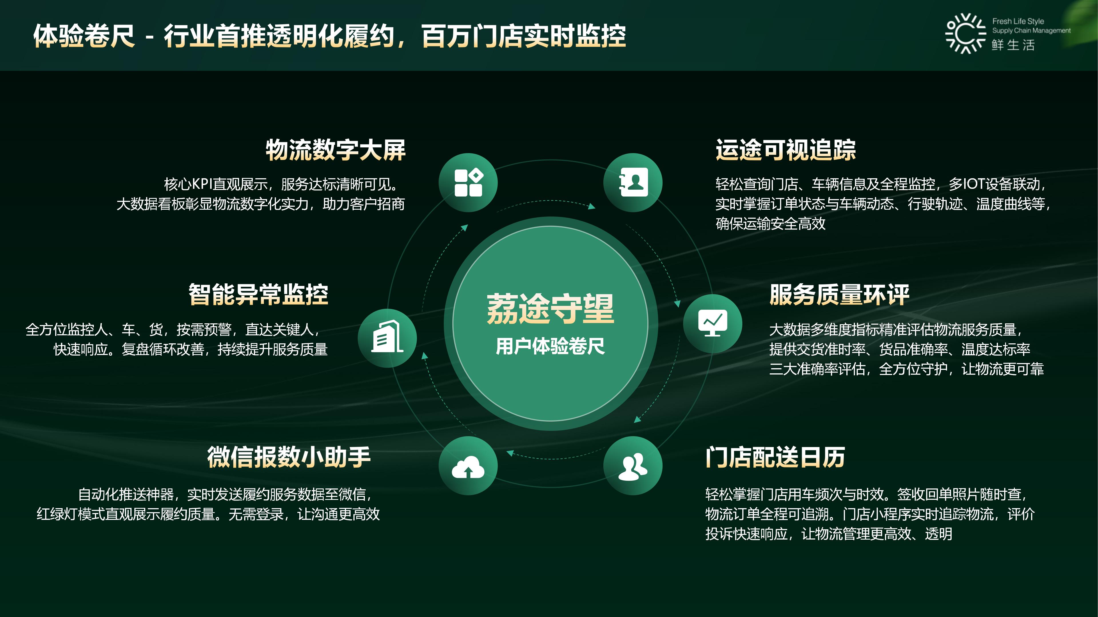 截止目前,运荔枝系统内已累计沉淀数据超过300亿条,AI改造节点超过100个,数据服务方案超过500例,获得80+项专利、100+项软著,构建了一套以软硬件为支撑、物联网为链接、AI为辅助决策手段的立体产品架构体系,为企业打造敏捷、弹性、高效的端到端数智化供应链,优化业务指标,提升运营能力。日均接单量超10万、入网冷链车超30万台、入网云仓超1,100万平米,合作冷链物流企业超3,000家。