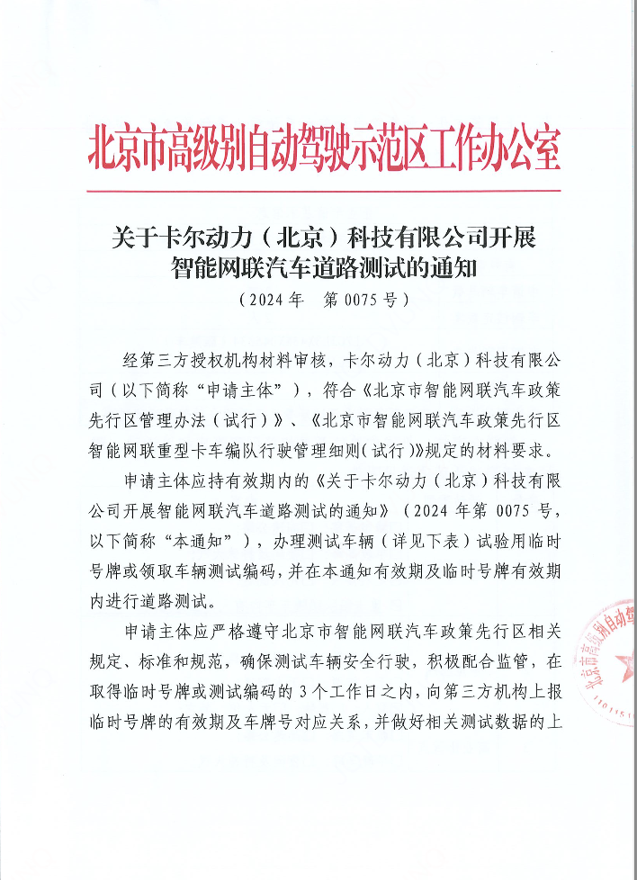 2024年5月,北京市率先发布智能网联重型卡车编队行驶管理细则,明确了卡车编队跟随车车内有人(主驾无人)验证与商业化探索双重发展路径。卡尔动力作为这一双重发展路径的代表企业,是首批获得北京市智能网联汽车政策先行区自动驾驶卡车编队行驶测试通知书的企业之一,公司获准在北京开放道路上进行L4级别的编队自动驾驶测试。而此次测试进一步进阶为重卡编队跟随车主驾无人的道路测试,充分展现了卡尔动力在自动驾驶技术领域的持续突破与领先优势,有序推进编队跟随车从“主驾无人”到“车内无人”的进程。